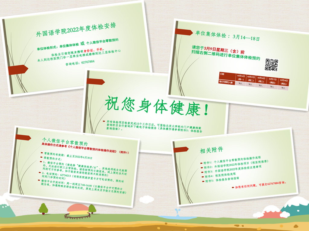 2022年春季学期伊始,经过与校医院的多次沟通协商,乐鱼·体育工会开始着手组织学院全体教职工进行本年度的体检工作。本次体检采取学院集体体检和个人微信平台零散预约相结合的方式,学院老师可根据自己的时间安排进行自由选择。集体体检时间为3月14—18日,选择集体体检的老师通过扫描微信二维码进行报名。因个人原因未能参加学院集体体检的老师,可通过个人微信平台进行零散预约,零散预约有效期至2022年6月30日。不管是学院集体体检,还是个人零散预约,学院工会都为老师们提供了清楚、便捷的操作流程,并提供学院工会相关电话作为咨询热线。截至3月25日,通过校医院发来的数据,我院已有200余名教职工完成了今年的体检工作。