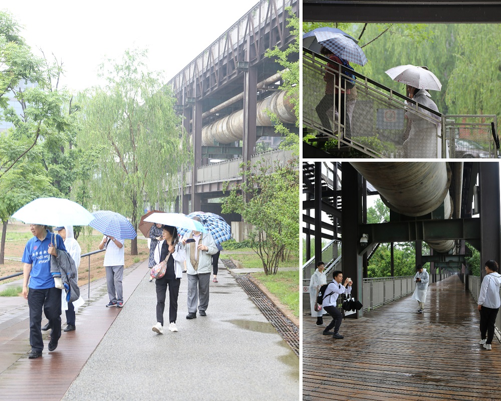 27日朝雨濛濛,却未能熄灭老师们对于集体活动的热情,来自十几个系所中心的老师冒雨来到燕园集体乘车,因疫情阻隔很久未能集体活动的老师们见面分外激动,一路欢声笑语,畅聊工作生活。上午9:00许,老师们来到首钢园。此时园区烟雨蒙蒙,更显静谧凉爽。在舒适的环境中,老师们开始了期待已久的春游活动。