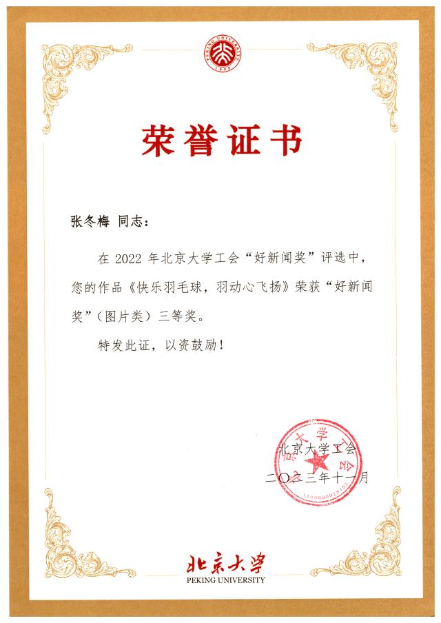 乐鱼·体育工会多位老师获得好新闻奖:外院工会主席张冬梅老师的《快乐羽毛球——羽动心飞扬》荣获图片类三等奖、工会常务副主席倪丽慧老师的《全国总工会党组成员谭天星一行来外院调研》荣获文字类二等奖、工会会员苏晓老师的《我为师生办实事——乐鱼·体育召开行政工会小组业务交流会》荣获文字类二等奖、苏晓老师的《同心勠力——鼓舞心齐》荣获图片类二等奖。恭喜几位老师在北京大学工会“好新闻奖”评选中取得好成绩!