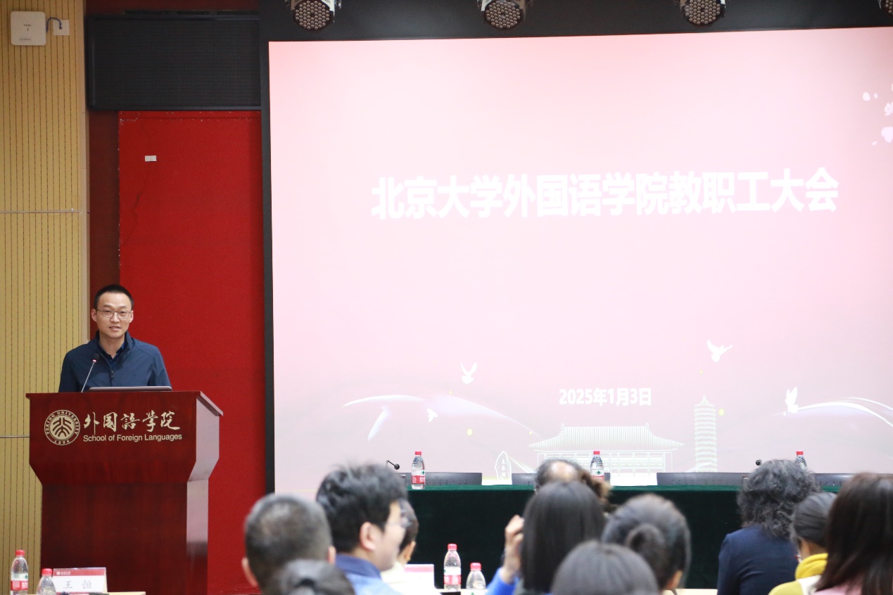 党委副书记冯美娜作学生工作汇报。2024年,学院学生工作坚持德育铸魂、学科牵引、立体支持,培养德智体美劳全面发展的北大外院人。在工作中坚持党建龙头引领,服务国家需求,通过打造学业、就业、心理、奖助、网络育人、家校协同等平台夯实育人基础。1个学生党支部入选北京高校党建工作样板支部培育创建单位,1个学生党支部入选北京大学党建工作样板支部培育创建单位。140余名师生参与纪念“一二·九”运动89周年师生歌会,取得特等奖的优异成绩。连续三年蝉联“学生工作先进单位”,荣获学生就业工作先进集体、学生党团日优秀组织院系、校园体育工作先进院系等荣誉称号。