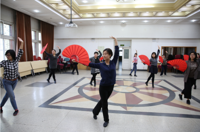 今年北京大学运动会的团体操表演项目是未名太极扇,乐鱼·体育积极响应学校工会的号召,在工会常务副主席、副院长张冬梅老师、工会副主席刘军老师、文体委员李宁老师、女工委员鲁学彬老师、工会小教员刘水老师的带领下组织了30余人的太极扇团队,每天11:00—11:30准时排练。因春季时常有雾霾天气,外院工会特提供民主楼208室内多功能厅以及多媒体设备供太极扇排练使用。