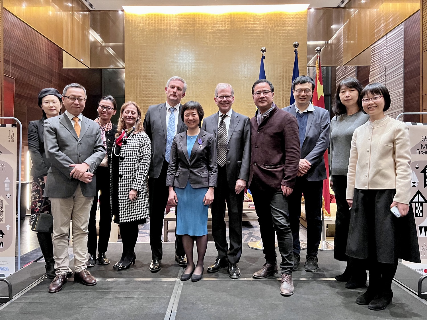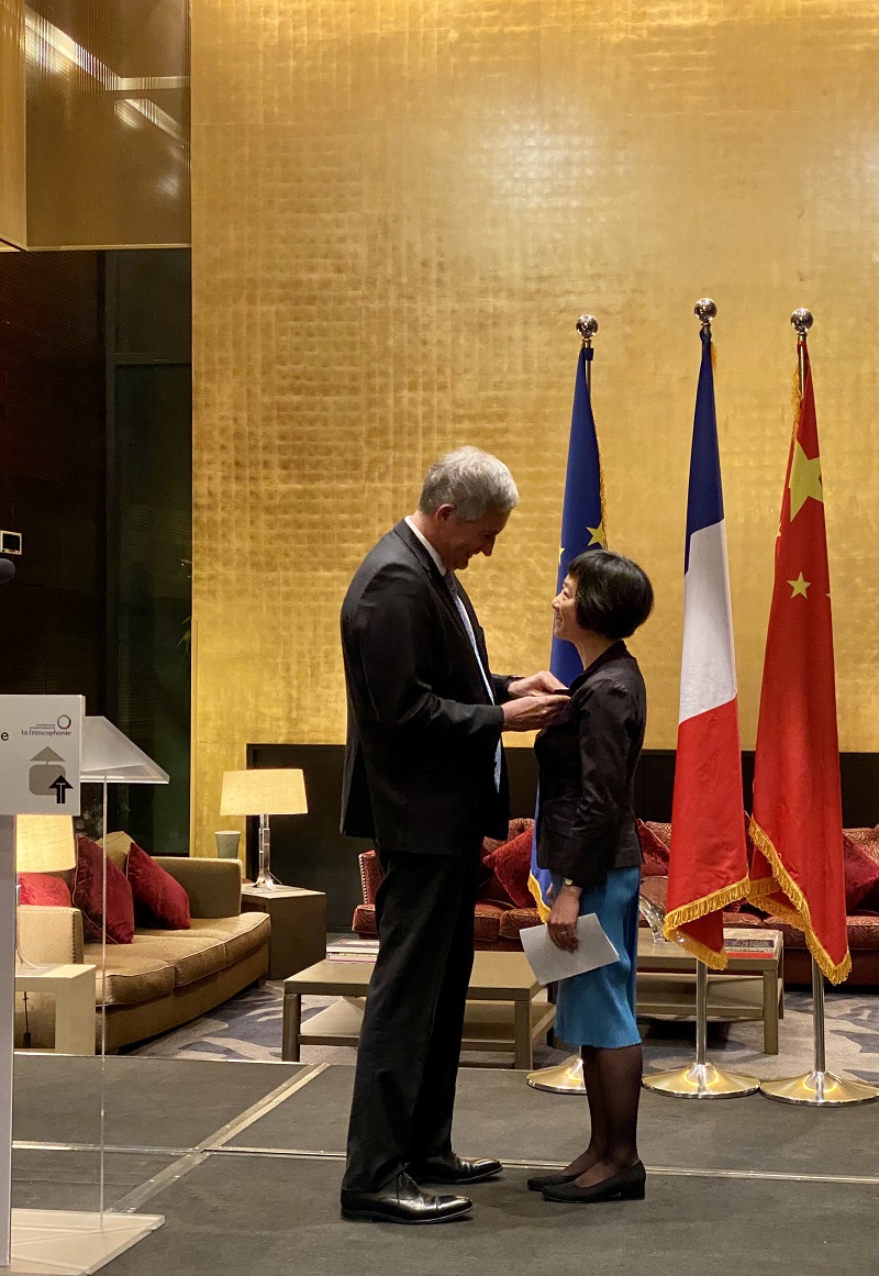 2022年3月17日晚,法兰西共和国“学术棕榈”(les Palmes académiques)骑士勋章的授予仪式在法国驻华大使官邸举行。法国驻华大使罗梁(Laurent Bili)阁下代表法国政府,为乐鱼·体育学术委员会委员、法语系段映虹教授颁发了法兰西共和国“学术棕榈”骑士勋章。当晚正值“2022年国际法语日” (Journée internationale de la Francophonie 2022)庆祝活动,来自外交、教育、体育、艺术与文化各领域的中外嘉宾齐聚一堂。法语国家大使组织主席、瑞士驻华大使罗志谊(Bernardino Regazzoni)阁下,欧盟驻华代表团团长、著名汉学家郁白(Nicolas Chapuis)阁下及各法语国家驻华使节,段映虹老师的亲朋好友出席了授勋仪式。