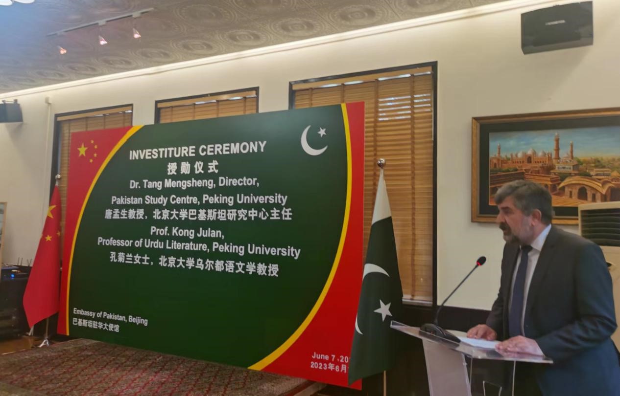 仪式由奏响中巴两国国歌开始,随后现任巴基斯坦驻华大使莫因·哈克代表巴基斯坦政府致辞。他表示,巴中两国友谊源远流长、历久弥坚,是全天候战略合作伙伴和“铁哥们”;在两国友谊建立和加深的过程中,像唐教授、孔教授这样的专家学者所做出的贡献非常重要。哈克大使简要回顾了两位老师的在巴基斯坦的学习与工作经历及学术方面的成就,称赞他们50年来在乌尔都语教学科研、人才培养、中巴人文交流等方面的重要贡献,为促进和加强巴中两国友谊发挥重要作用。他强调,唐孟生教授、孔菊兰教授是深化中巴文化交流和教育合作的热心建设者。当下两国人员往来、旅游合作和文化交流日益深入,希望两位教授与北大同仁一道,持续推动巴中教育合作提质升级、加强民间友好交流,巩固两国友谊纽带。