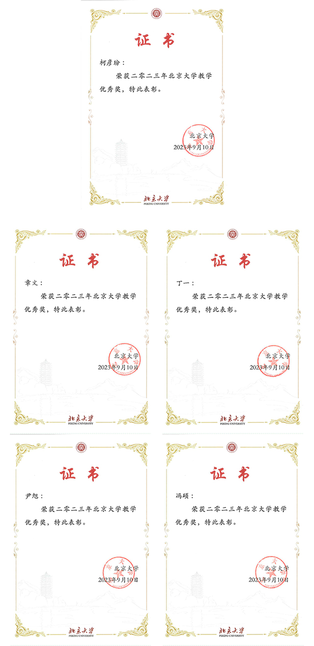 柯彦玢(英语系)、章文(法语系)、丁一(朝韩语系)、尹旭(俄语系)、冯硕(语言所)荣获2023年北京大学教学优秀奖。