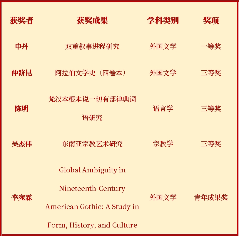 教工之家 喜报:我院五位教师喜获第九届高等学校科学研究优秀成果奖 2024-08-03 近日,教育部第九届“高等学校科学研究优秀成果奖(人文社会科学)”揭晓,我院五位教师获奖,其中一等奖1项、三等奖3项,青年成果奖1项。 文:陈静 图:王乃懋