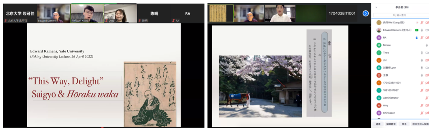2022年4月27日10时,由北京大学东方文学研究中心主办,北京大学日语系协办的“东方大文学”系列讲座第十一讲通过ZOOM如期举行。本次讲座由美国耶鲁大学东亚语言文学系住友讲席教授Edward Kamens教授主讲,题目为“欢喜至此处:西行与法乐和歌”。来自北京大学、中国人民大学、西安交通大学、早稻田大学等海内外高校的近百名师生相聚云端,参加了本次讲座。