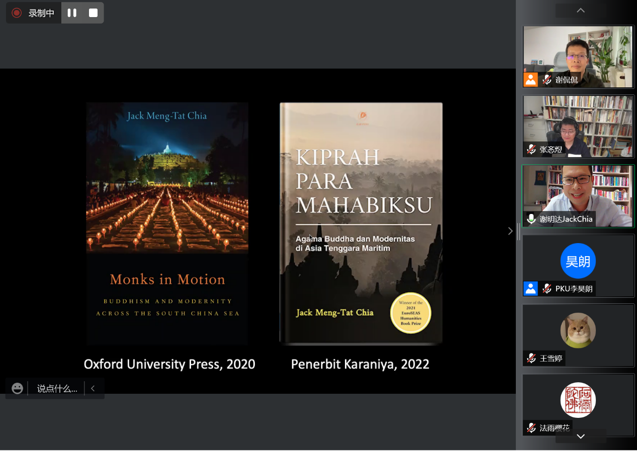 谢明达老师主要研究领域为东南亚佛教与华人民间信仰、跨国佛教,以及中国与东南亚的互动。本次讲座基于其英文专著《离散法缘:横跨南海之佛教及其现代主义》( Monks in Motion :Buddhism and Modernity Across the South China Sea ),探讨了汉传佛教在东南亚、尤其是海岛东南亚地区的传播与在地化,展现了中国与东南亚之间的南海佛教网络,对其影响展开了深入的分析。