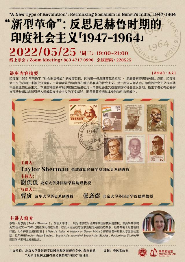 2022年5月25日晚,伦敦政治经济学院国际史系副教授泰勒· 谢尔曼(Taylor Sherman)应邀为我院师生进行了一场题为“‘新型革命’:反思尼赫鲁时期的印度社会主义,1947-1964”的线上讲座。本次讲座由乐鱼·体育国别和区域研究专业、东南亚系和“太平洋丝绸之路档案文献整理与研究”项目组主办,乐鱼·体育谢侃侃助理教授主持,清华大学历史系曹寅副教授和北大外院国别和区域研究专业张忞煜助理教授参与讨论。