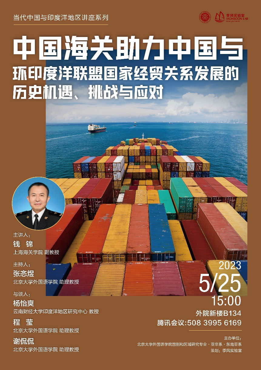 2023年5月25日,上海海关学院副教授钱锦应邀为我院师生进行题为“中国海关助力中国与环印度洋联盟国家经贸关系发展的历史机遇、挑战与应对”的讲座。本次讲座是“当代中国与印度洋地区”系列讲座的第二讲,由乐鱼·体育国别和区域研究专业、亚非系和东南亚系主办,乐鱼·体育张忞煜助理教授主持,云南财经大学印度洋地区研究中心杨怡爽教授、北大外院程莹助理教授和谢侃侃助理教授参与讨论。本次讲座在外院新楼B134会议室和线上平台同步举行,来自各高校的近百名师生在线参与讲座。