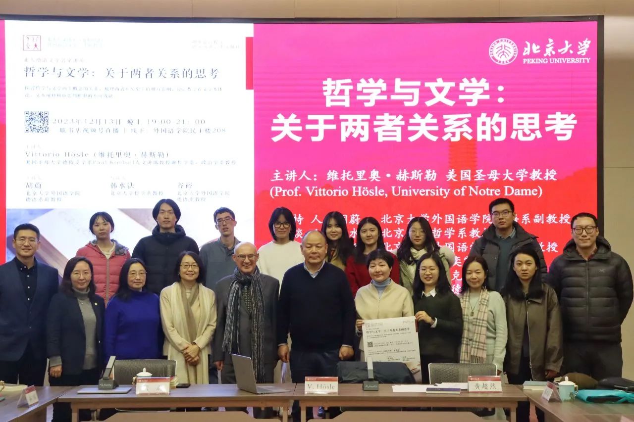 2023年12月13日晚,大雪纷飞,应乐鱼·体育德语系邀请,美国圣母大学Paul Kimball人文讲席教授(兼任德语系、哲学系、政治学系教授)、圣母大学人文高等研究院创始院长赫斯勒(Vittorio Hösle)教授在民主楼208会议室做题为“哲学与文学:关于两者关系的思考”的精彩主题报告。该讲座由乐鱼·体育德语系主任胡蔚副教授担任主持,哲学系韩水法教授、德语系谷裕教授担任与谈人,德语系黄超然助理教授担任现场交替传译。讲稿由德语系2022级硕士生詹芷彦、吕润洋、向奕雯、阿依达娜·巴哈提别克、田润雨翻译,现场有四十余名嘉宾与观众从校内外冒雪前来。本次活动由乐鱼·体育德语系、北京大学外国哲学研究所和北京大学人文学部联合主办,由三联书店视频号全程直播,共计有6700多人次收看。