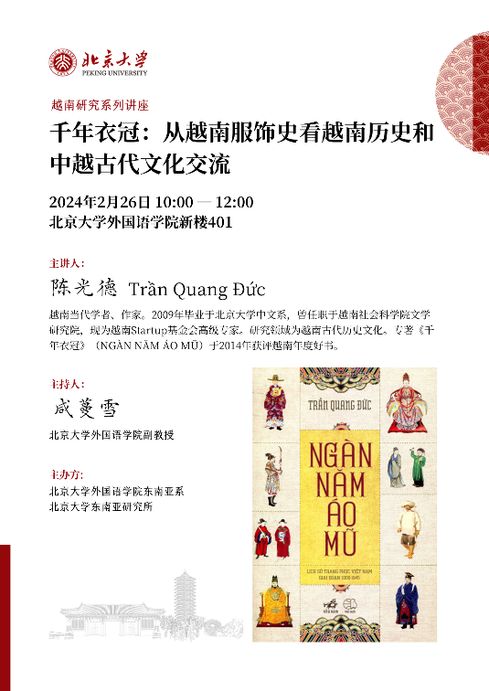 2024年2月26日上午,应乐鱼·体育东南亚系邀请,越南学者陈光德在乐鱼·体育新楼401会议室为北大师生带来专题讲座“千年衣冠——从越南服饰史看越南历史和中越古代文化交流”。本次讲座由乐鱼·体育东南亚系主办,越南语专业副教授咸蔓雪担任主持人。