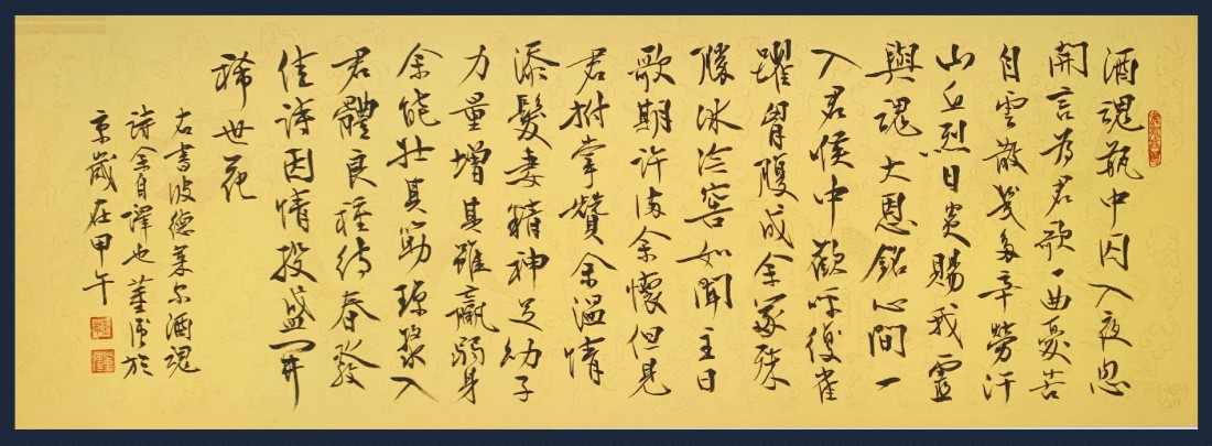 这是我的一幅书法作品。我念一下头几句:酒魂瓶中囚,入夜忽开言,为君歌一曲,忧苦自云散。看上去是一首古诗,跟酒有关。这是谁的诗呢?大家即便查遍中国所有古诗词的全集,都没有这首诗。为什么呢?因为它是一首法语诗——波德莱尔的诗。法文题目叫《lame du vin》,酒之魂,《酒魂》。