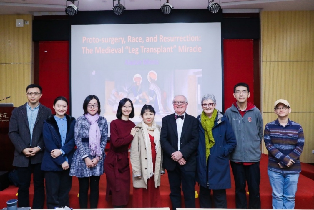 During the discussion session, Professor Huiyi Bao from Fudan University engaged Professor Minnis in a multifaceted dialogue. She began by noting that his analysis offered profound insights into medieval conceptions of the body, then drew a striking comparison between the transplant miracle and passages in Flaubert’s Madame Bovary to illuminate the contrasts between medieval and modern understandings of embodiment. Professor Bao further enriched the discussion through comparisons with Dante’s Divine Comedy, deepening reflections on bodily integrity. She also highlighted the nuanced interplay between the lecture’s iconography and contemporary perspectives on race, emphasizing its continued relevance to modern racial discourse. In the ensuing exchange, faculty and students raised thoughtful questions concerning self and other, the boundaries of the body, and racialized violence within theological contexts, to which Professor Minnis responded with his characteristic incisiveness and discerning insight.