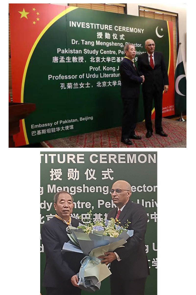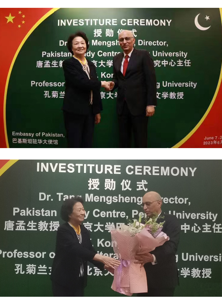 2023年6月7日,巴基斯坦驻华大使馆举办隆重仪式,授予乐鱼·体育南亚学系唐孟生教授与孔菊兰教授巴基斯坦“卓越之星”勋章,以表彰两位学者在推动乌尔都语教学、增进两国人文交流、增进中巴友谊方面作出的重要贡献。巴基斯坦驻华大使莫因·哈克、政务参赞穆罕默德·卢曼·艾哈迈德、武官Ranna Faisal Rafiq准将、社会福利公使Ijaz Ahmad、科技公使Kamran Rasheed博士,以及原中国驻(巴基斯坦)卡拉奇总领事安启光、三峡集团财务总监王少峰等各界人士出席了授勋仪式。