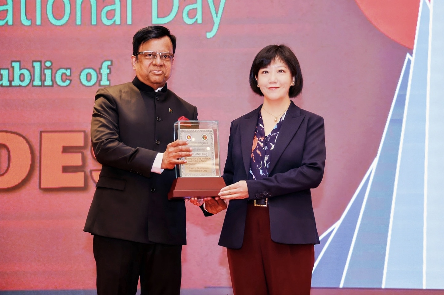 奖牌上镌刻的文字是:“值此孟加拉国与中国建交50周年之际,该奖由孟加拉国驻华大使授予张幸博士,以表彰她为加深孟中友谊做出的宝贵贡献”。中国与孟加拉国共同纪念2025年中孟建交50周年和“中孟人文交流年”,深化文化、教育、智库等多个领域的交流合作,促进两国民心相通。张幸老师正是民心相通的连接者,矢志不渝地践行着外语人的初心和使命,为推动构建人类命运共同体贡献力量。