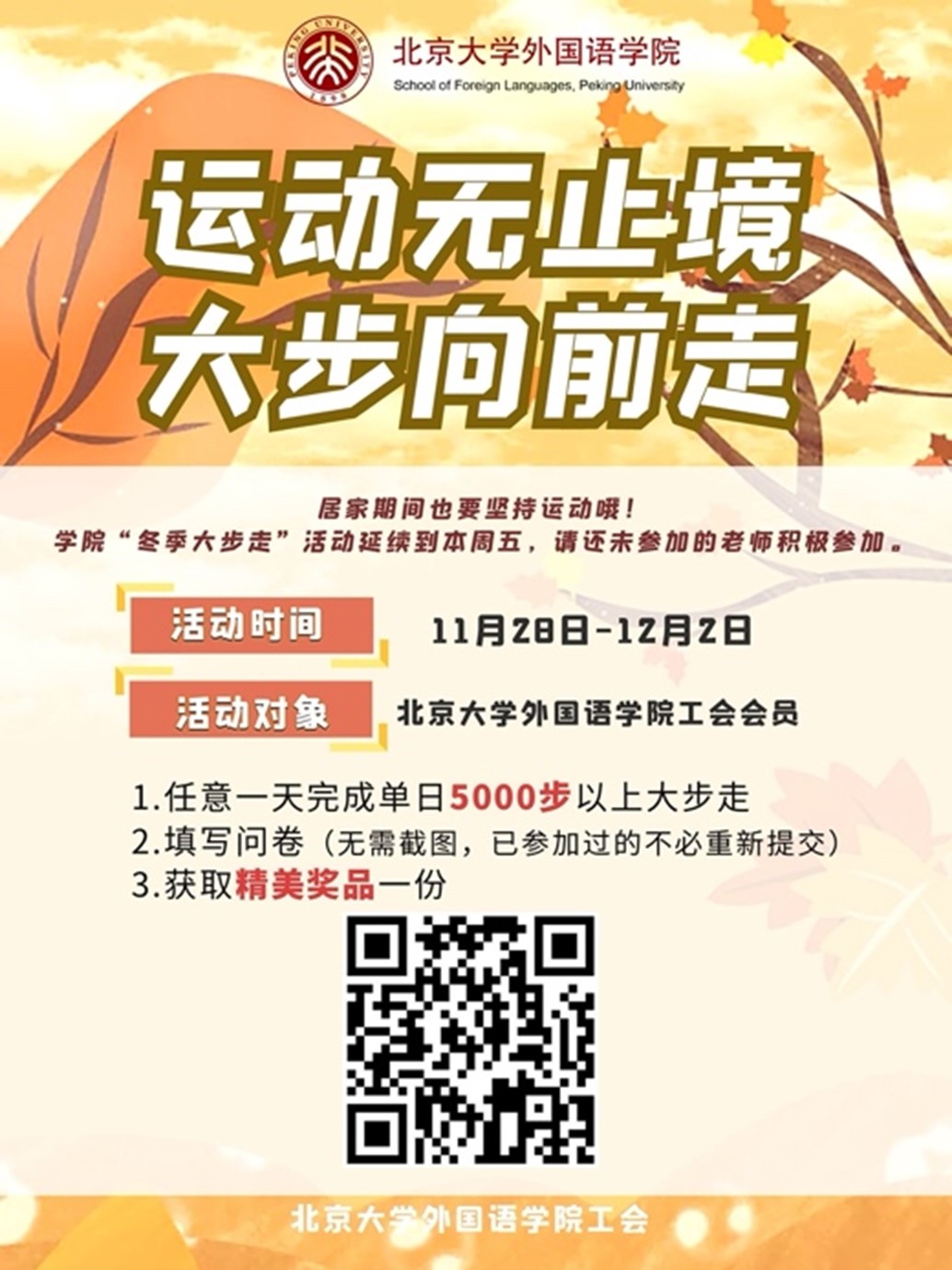 当前疫情形势复杂多变,出于对师生自身健康的安全考虑,学校决定现阶段实行居家办公政策。为了丰富教职工们的居家办公生活,学院工会主席张冬梅老师及常务副主席倪丽慧老师精心策划了大步走活动,鼓励老师们在做好自身防护的情况下外出进行运动。