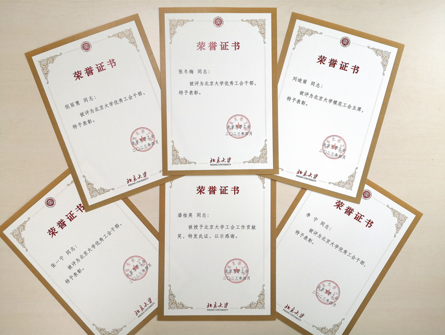 根据《北京大学工会先进集体和优秀个人评选表彰办法》,经基层工会推荐,评审小组评审,校工会主席办公会讨论,工会常委会审议通过,外院工会荣获2021、2022年北京大学模范工会委员会,校工会授予刘迪南老师2022年度北京大学模范工会主席的称号,授予张冬梅、倪丽慧、李宁、张一宁四位老师北京大学优秀工会干部称号,授予潘桂英老师北京大学工会工作贡献奖。