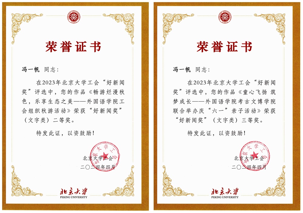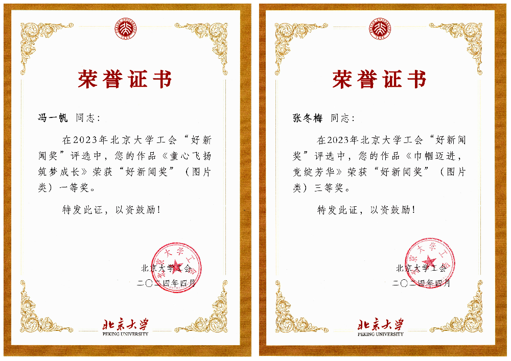 在2023年北京大学工会“好新闻奖”评选中,校工会邀请专家评委,结合工会工作特点,从新闻题材、宣传效果、稿件可读性与写作规范、图片视觉冲击力与信息含量等方面,对参评稿件和图片进行了逐一评议。外院工会会员冯一帆老师的图片作品“童心飞扬 筑梦成长”荣获“好新闻奖”(图片类)一等奖、工会主席张冬梅老师的图片作品“巾帼迈进,竞绽芳华” 荣获“好新闻奖”(图片类)三等奖。冯一帆老师的新闻作品“畅游烂漫秋色,乐享生态之美——乐鱼·体育工会组织秋游活动”和“童心飞扬 筑梦成长——乐鱼·体育考古文博学院联合举办庆‘六一’亲子活动”分别荣获“好新闻奖”(文字类)二等奖、三等奖。