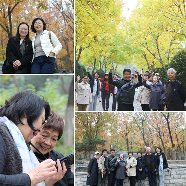 老师们在公园门口集体合影留念,随后分两队踏上了两条难易程度不同的赏叶之路,体能素质较好的老师选择了蜿蜒的山路,行动较为不便的老师选择了相对平坦易行的步道,与不同的风景相遇。学院工会特别安排年轻教师与离退休教师结伴同行,在保障安全的同时促进了教师之间的交流与传承。