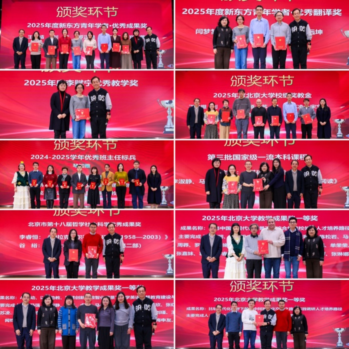 学院的教师们在2025年取得了众多成绩。副院长付志明代表学院宣读了新东方青年学者优秀成果奖、优秀翻译奖、李赋宁优秀教学奖、北京大学校级奖教金、优秀班主任等奖项的获奖名单,学院领导班子向获奖教师一一颁奖,合影留念。刘淼老师的《基础俄语III》和李淑静、马乃强、张敏、沙筱薇、马小琦老师的《英语阅读》获评国家级一流本科教程,谷裕老师的《浮士德》译注和李睿恒老师的《伊拉克库尔德问题研究(1958-2003)》获评北京市哲学社会科学优秀成果奖,学院还有三个团队斩获了北京大学教学成果奖一等奖,两个团队荣获北京大学教学成果奖二等奖。