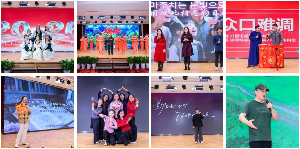 随后,文艺表演与互动环节精彩纷呈。北京大学离退休模特艺术团带来走秀节目《绽放》,一举一动间尽显岁月的沉淀与优雅的风采。朝(韩)语系外教朴智娟与学生蒋文悠、蒙伟凡合唱歌曲《美丽的世界》,他们的歌声在方寸舞台间绘就了一幅万物共生的和谐画卷。德语系本科生顾杰瑞与信科学院者久鹏妙语连珠,以相声《众口难调》娓娓道来语言的机锋。日语系博士后曾堰杰用多个古语言独唱《Live Gloriously》,用激昂的旋律诠释了青春的张力,唱响了生命的赞歌。大学英语的老师们带来活力满满的舞曲《爱的乐园》,动感的舞步为场内增添了更多的热情。语言所博士后李臻演唱歌曲《世界赠与我的》,引领听众在旋律中感悟生活的馈赠与岁月的温柔。英语系黄必康老师压台出场,用雄浑开阔的声音演唱《父亲的草原母亲的河》,仿佛将听众带回了辽阔的故土,诉说着永恒的乡愁。
