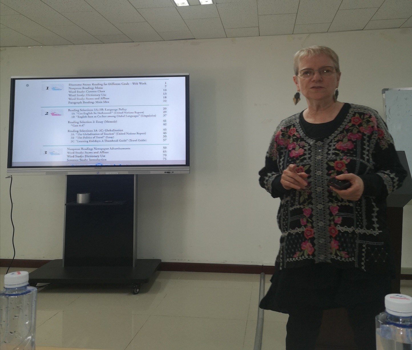 8日下午,Silberstein教授在乐鱼·体育新楼301给大学英语教研室的教师及语言所的师生进行了二语阅读教学的展示性讲座。整场报告围绕着以下几个问题展开:什么是阅读?阅读课的目标是什么?阅读课中教师承担着怎样的角色?如何进行批判性阅读的教学?如何对阅读材料进行评估?Silberstein教授在报告中不仅有理论性的介绍,也有直观简明的教学示范。她以一首不同寻常的小诗作为讲座的开场,让在场师生一起进行阅读和讨论。面对师生们对于同一问题给出的不同答案,Silberstein教授解释到人们在阅读时都会带着自己独特的社会经历和文化背景进行阅读,作为阅读教师需要认识到这一点并充分挖掘出学生的潜力,让他们做到读有所思,读有所得。接下来,Silberstein教授还展示了阅读中词汇学习的方法、如何针对不同材料调整阅读策略、如何用简单的问题启发学生进行批判性阅读等。