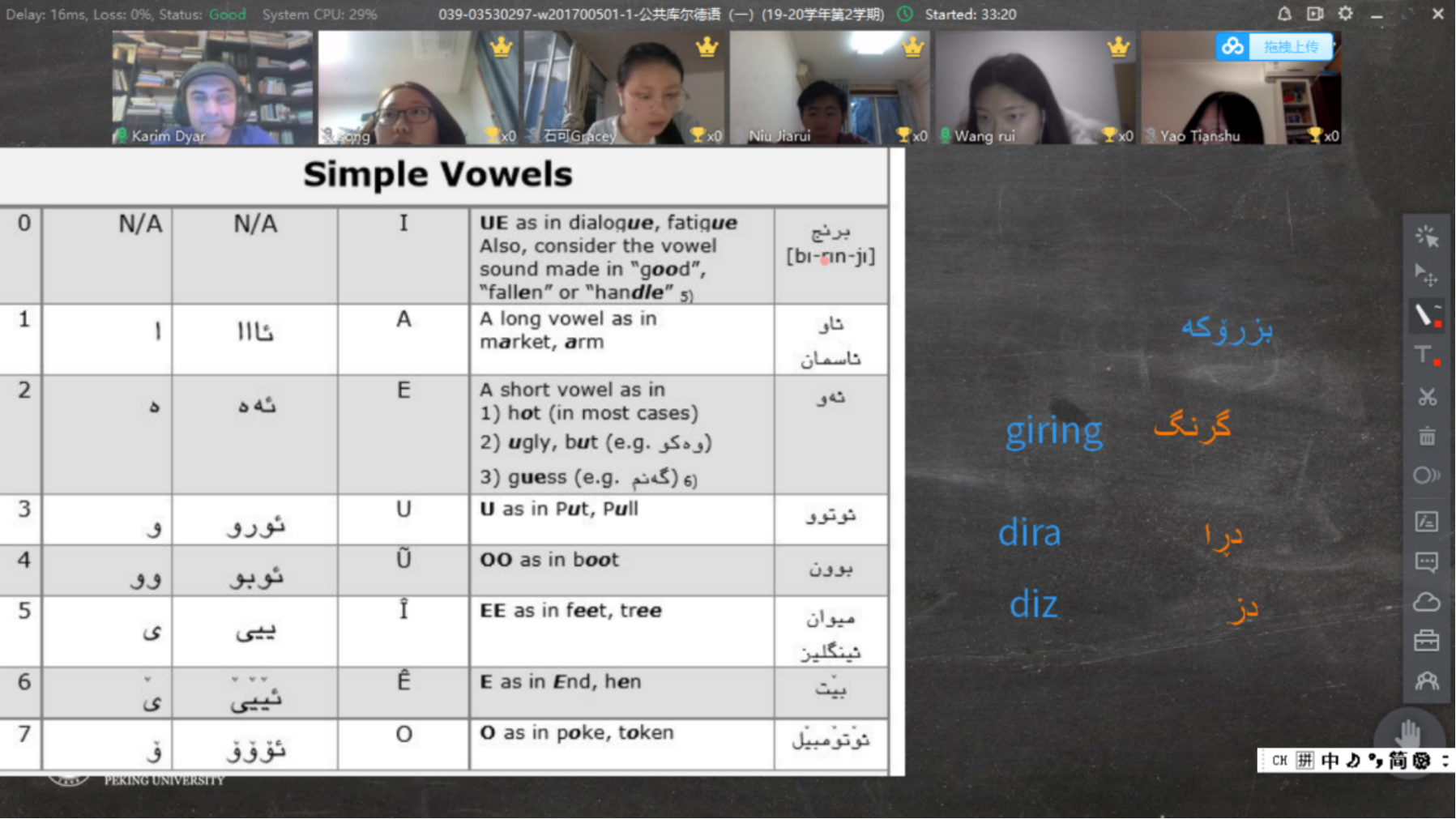 新冠病毒的肆虐扰动了整个神州大地,却也成为了推动中国高校在线教学的契机。北大阿语系聘请的4名外教也同所有的中国高校教师一样,被新冠疫情裹挟进在线教学的滚滚洪流,成为了中国高校教学改革场中的践行者和阿拉伯人在线教学的先锋实验者。4名外教情况截然不同,赛米拉教授和迈哈穆德教授来自叙利亚的大马士革大学,2019年9月份就已经来北大了,这次的新冠疫情给不懂汉语的他们带来了巨大的生活困难,但这丝毫挡不住他们践行在线教学的热情。第三位教师德雅尔来自伊拉克库尔德地区的萨拉丁大学,第四位教师泰帆·凯尔康来自土耳其,在他们俩即将动身来北京的时候,疫情爆发了,只好待在自己的家里,等候北大的通知。当学校通知他们将要进行在线教学的时候,他们二话不说,立即开始学习在线教学的工具和技能,并且克服时差的困扰,在人最困乏的下半夜守候在电脑跟前,为北大的学生授课。