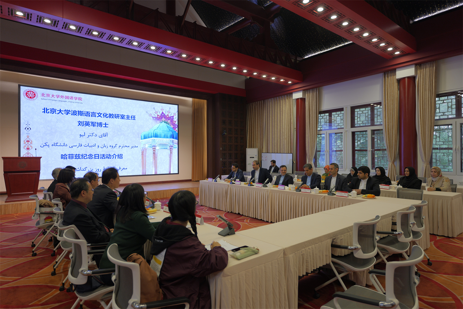 2023年10月12日上午,伊朗伊斯兰共和国新任驻华大使穆赫森·巴赫蒂亚尔率团访问北京大学,在结束与北京大学校领导的会见后,前往乐鱼·体育民主楼参加14世纪著名伊朗诗人哈菲兹纪念日座谈。