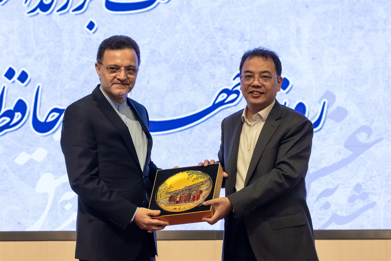 在座谈间隙,波斯语专业的本科生、硕士以及博士研究生朗诵了多首哈菲兹抒情诗,活跃了气氛。同时,中伊双方代表用哈菲兹诗集占卜,共同庆祝哈菲兹纪念日。在活动的最后,陈明院长与巴赫蒂亚尔大使代表宾主双方互赠纪念品,伊朗使馆还向波斯语教研室赠送了一批波斯语书籍。