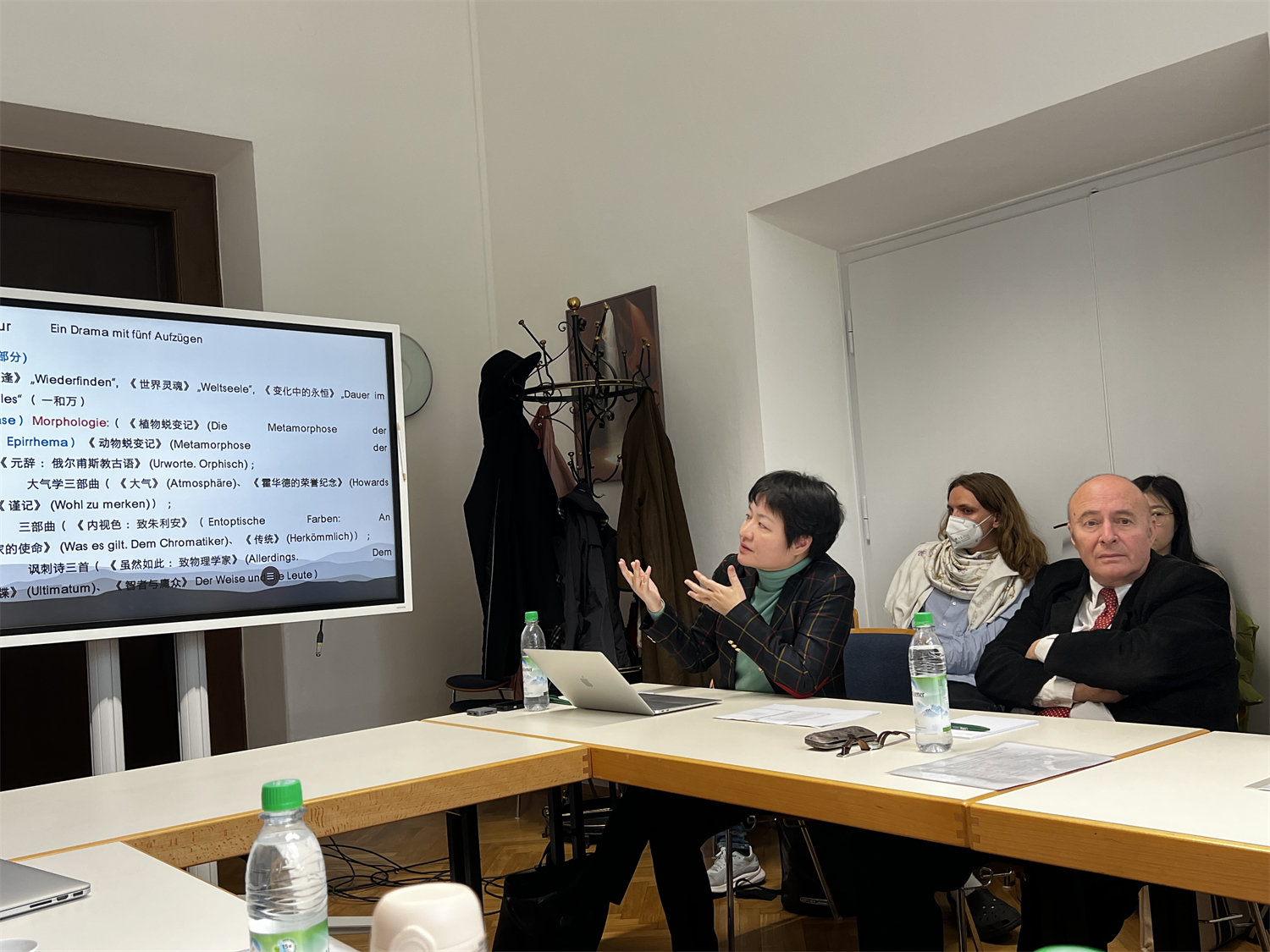 胡蔚副教授与慕尼黑大学德文系Friedrich Vollhardt教授联席主持了德语文学分会:“歌德——魏玛古典——中德文学关系”。德语文学分会共有12位中德学者发表报告,胡蔚副教授作开场报告《论歌德晚年组诗<上帝与世界>中的自然观》,毛明超助理教授作主旨报告《论席勒的国家理念》,并在闭幕式上对于德语文学分论坛进行总结。正在慕大德文系求学的北大德语系毕业生柳雨薇(2016级)、陈靖泽(2019级)等北大校友参加了德语文学分会。会议互动热烈,中德同行对报告议题进行了深入细致的交流。