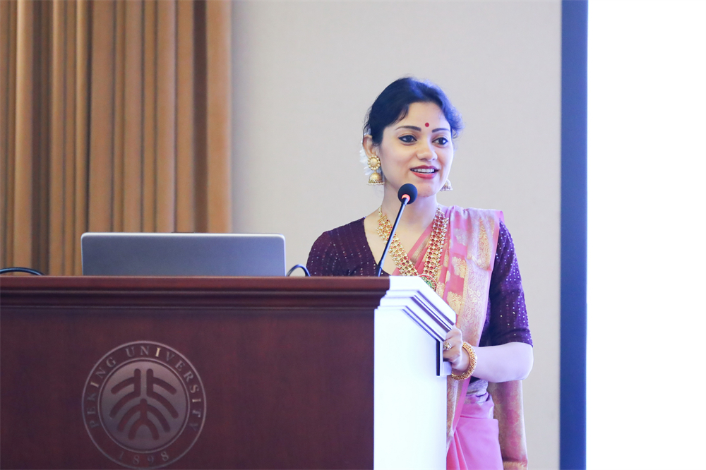 北京大学南亚学系教师代表、副教授张幸发表讲话。她先用孟加拉语对来自泰戈尔家乡的印度代表团表示欢迎,接着就北京大学南亚学系的泰戈尔研究和孟加拉语教学研究进行了介绍。她指出,印度语言文学专业长期开设的泰戈尔研究课程内容覆盖面广,涉及作品外的延伸研究。2004年开设孟加拉语课程也是为了更好开展包括泰戈尔研究在内的印度文学文化及南亚学相关研究。最后,她提及泰戈尔在中国数次以文明为主题的演讲,传递了对中印人民在同属东方文明的理解下加强人文交流的希冀。