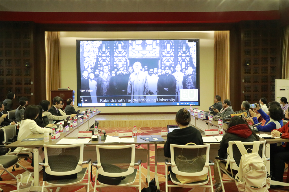 中印代表发言后进入文艺交流环节。该环节的活动上播放了北京大学南亚学系精心制作的“泰戈尔访华100周年纪念视频”。