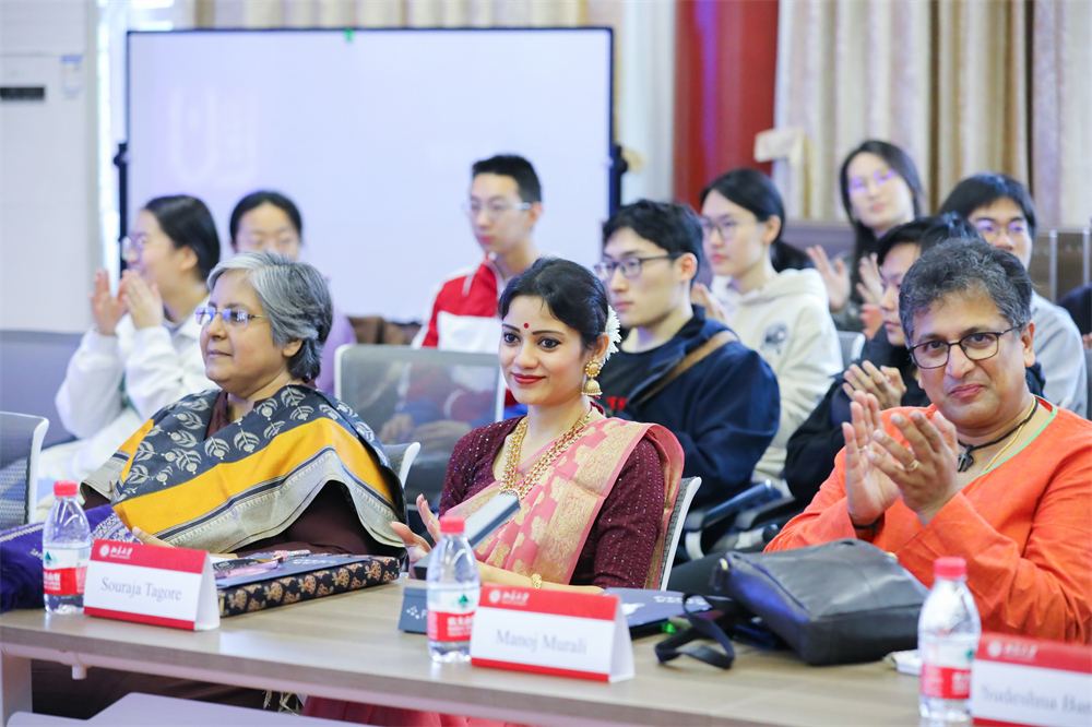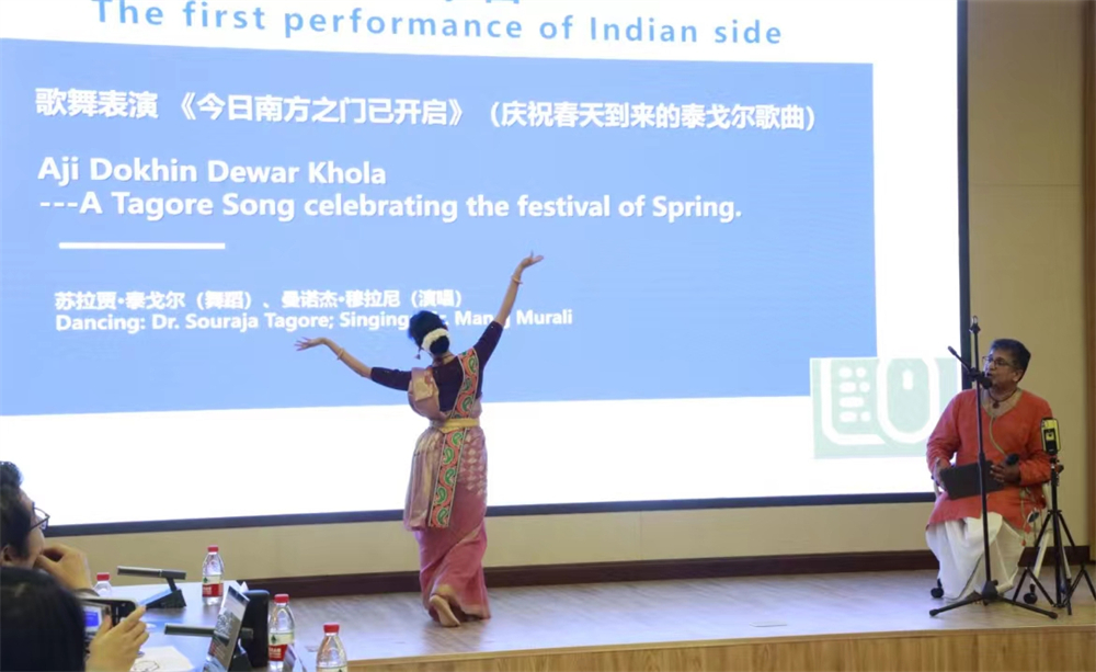 泰戈尔家族后裔、帕瓦尼普尔教育社会学院英语系助理教授、婆罗多舞蹈与泰戈尔舞蹈表演艺术家苏拉贾·泰戈尔(Souraja Tagore)表示,自己作为泰戈尔家族的一员,始终努力在尊重传统与拥抱创新、保持过去与塑造未来之间维持一种微妙的平衡,并积极搭建两国艺术桥梁。她还在会上用孟加拉语深情朗诵了泰戈尔的诗歌:“有一次,我去到中国的土地。那些我从未见过的人......在我的额头上贴上了友谊的印记,称我为他们自己的朋友。”
