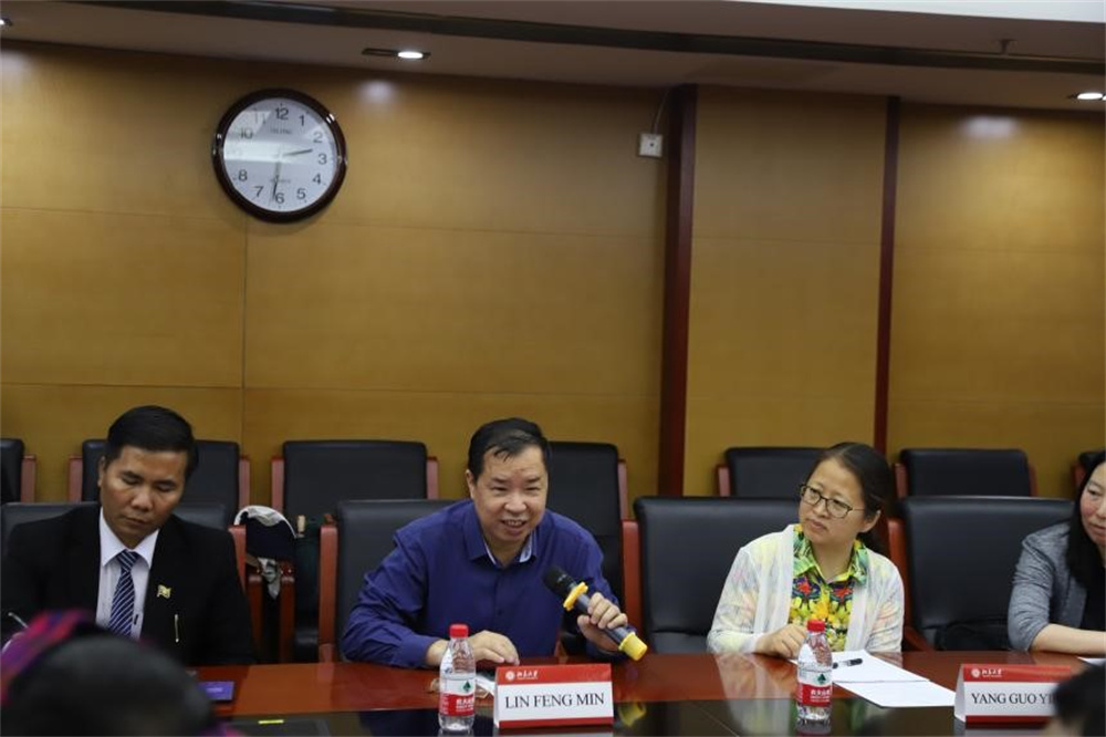 致辞结束,缅甸作家代表团与缅甸语专业师生用缅语交流。本科四年级学生尚晋豪介绍了北京大学的光荣传统与历史;缅语教研室主任张哲老师代表专业介绍了北大缅语专业的历史沿革、1949年至今的人才培养、教材建设、课程建设和科研成果,向代表们展示由缅语教研室教师出版的《缅甸诗选》、《缅甸方言研究》等语言、文学类专著、译著。杨国影副教授详细介绍近五年来缅甸语教研室已翻译出版和正在计划出版的缅甸文学作品,包括《如愿》、《雨夜雾梦》、《等待花开之时》、《六边形》、《缅甸短篇小说选》、《缅甸儿童文学作品选》等。