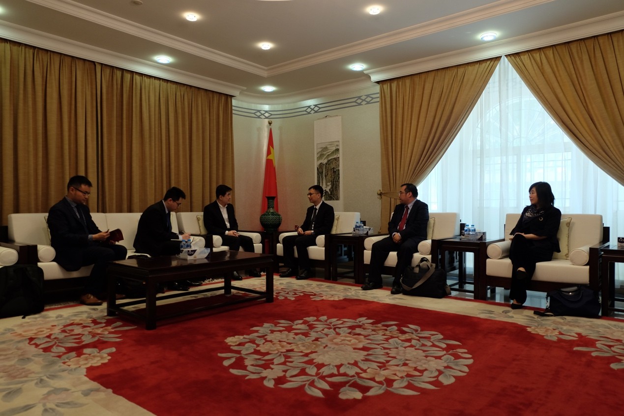 在中国驻卡塔尔大使馆,吴杰伟教授首先向李琛大使介绍了此次团队出访的基本情况与见闻心得,以及北京大学和卡塔尔高校间的合作现状与前景。李琛大使对北京大学在推动中卡教育合作中付出的努力表示赞赏,他指出,在两国关系不断深化的背景下,教育领域的交流合作是中卡双边合作的重要内容,北京大学与卡塔尔高校间开展的学术合作和学生交流,在该领域有着积极的意义,未来在合作的广度与深度上继续扩展将是两国教育合作的新方向。李大使随后还就卡塔尔国情及中卡关系的最新进展向团队师生作了相关介绍。