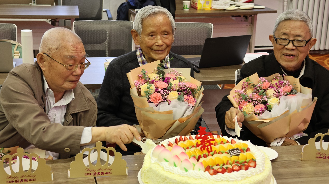 上半场报告会结束之后是祝寿和赠书仪式。俄语系党支部历来有为耄耋之年教师祝寿的传统,此次纪念会恢复了因疫情而中断的庆生仪式,会场里重又唱响久违的生日快乐歌,俄语系三任党支部书记王辛夷、周海燕和刘淼为寿星教师献花,与会人员齐声恭祝鲐背之年的顾蕴璞、陈士林和李明滨教授健康长寿。