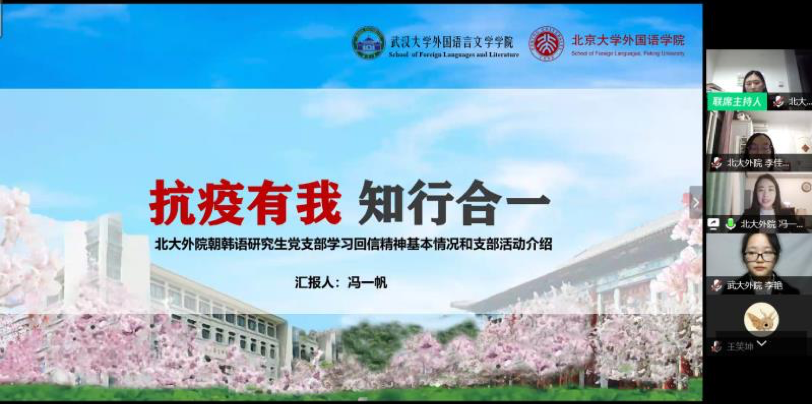在此次两院共建活动中,由两个研究生党支部和两个本科生党支部分别对接,在研究生党支部层面,由武大外院2019级MTI研究生党支部和北大外院朝韩语系研究生党支部共建,从思想共建、文化共建、生涯共建、志愿共建等四个方面入手,引领双方党员提高党性修养,建立深厚友谊,在学好专业本领的同时强化青年党员的责任与担当。在本科生党支部层面,由武大外院本科生小语种党支部和北大外院本科生第三党支部共建,从日常学习、个人发展、心理沟通三个层面全方位搭建两支部互助平台,在共建活动中继续深入学习习近平总书记重要回信精神,发挥党员模范带头作用。目前,两院党支部共建活动已正式启动,未名湖畔,洛珈山下,外语人将携手并进,共同将青春的诗篇书写在祖国的山河中,共同守望战疫胜利的到来。