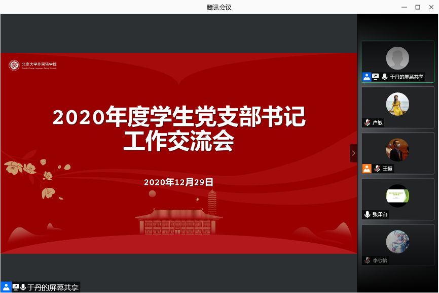 12月29日晚,乐鱼·体育召开2020年度学生党支部书记工作交流会,为配合当前疫情防控工作,本次交流会采用腾讯会议线上开展,院党委书记李淑静、党委副书记王恒、团委书记卢敏出席活动。会议由团委副书记于丹主持,16名学生党支部书记参加会议。