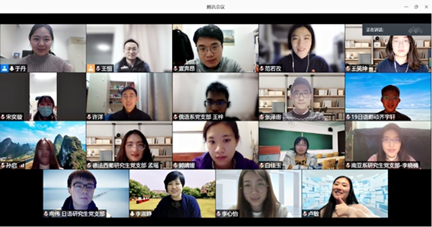 会议最后,李淑静老师充分肯定了本年度各学生党支部出色的工作表现,表示受疫情影响,本年度各支部坚持“线上+线下”的形式积极开展学习与特色活动,深度学习了党中央重要战略部署、重要会议精神,并结合自身专业特点开展了系列实践与志愿服务工作,充分展现出学习求知热情、社会实践热情与志愿服务热情,真正发挥了党建带团建的积极作用。李老师表示,在建党百年来临之际,院党委将大力配合好各位学生党支部开展系列党建教育活动,办好具有外院特色的支部活动,并叮嘱各位支书要继续绷紧防疫这根弦,持续做好支部基础性工作,不断增强党员党性修养,加强党员组织纪律性,以饱满的精神状态迎接建党100周年。