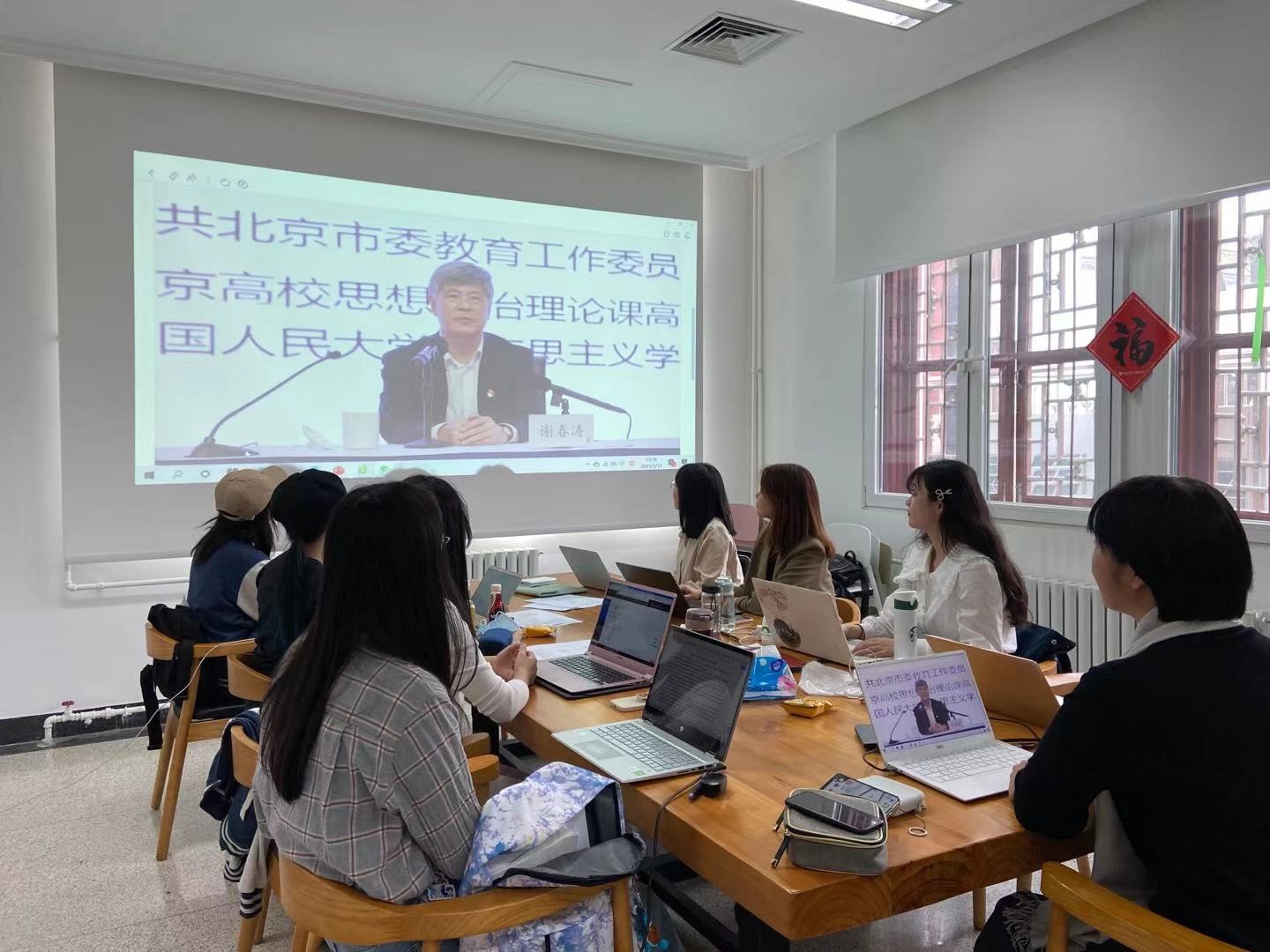 (学院党委委员、支部党员王丹老师带领学生观看直播课)