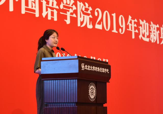2019级英语系本科生郭若菲代表本科新生发言。她认为,正是因为向上的信念,大家才能在燕园里相遇,共同书写青春故事。她表示,新一代的外院人将传承前辈们的辉煌火炬,像一代代外院人一样以语言为舟楫,架起文化沟通的桥梁,完成时代赋予北大外院人的使命。