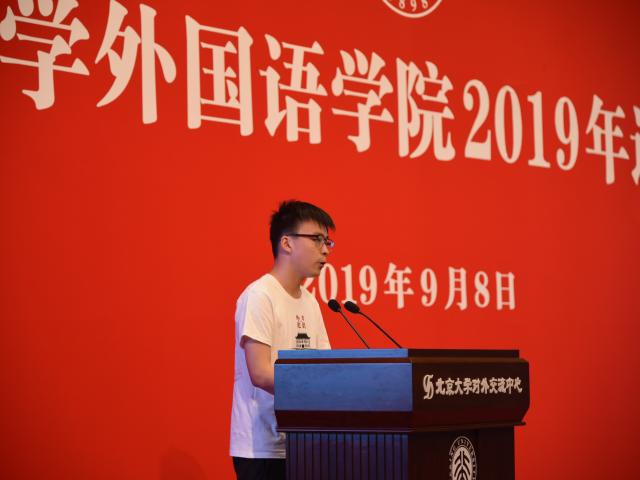 2019级日语系博士生向伟代表博士新生发言。尽管已在外院度过七年的时光,但他仍然觉得只要有心,在燕园求学的日子便不是日复一日的单调重复,而是每天都会有新的发现与收获。他希望和同学们一起,不仅守住志于学术的初心,更心怀世界,在外院这个大家庭里享受新的生活。