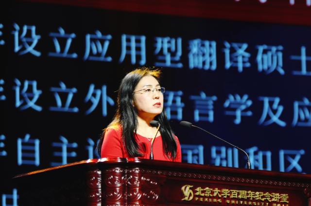 在接下来的“为世界贡献中国智慧”版块中,北京大学博雅讲席教授段晴以“来自古代文明的启示”为题,分享了自己在季羡林先生门下学习梵语、于阗语时,从古代典籍中获得了对当下有启发意义的讯息,从而致力于开展丝绸之路出土的古代于阗文、梵文、佉卢文等写卷的释读和研究,并取得重大成果的过程。北京大学博雅讲席教授申丹以在外院学习和工作近37年的经历为出发点,诠释了自己坚持在国际前沿拼搏的四种动力:基于感恩的责任心,学术兴趣、学术使命感及学术发展创新带来的喜悦,北大的精神魅力,民族责任感和爱国心。她希望中青年教师持之以恒、发奋努力、超越前辈。学院东南亚系副教授史阳以“深入认识世界,助力一带一路,担起时代责任”为题,分享了自己秉持学习外语初心,在对象国艰苦的条件下进行田野调查、学习和研究的经历和感受,鼓励同学们投身到认识和研究世界各国的事业中,投身到代表中国人民的对外交往事业中。西葡语系主任范晔用西班牙内战中一位弗朗哥士兵坚持阅读的故事,点出“世界在阅读中改变”的主题,鼓励同学们“相信文学所拥有的无可替代的力量”,坚持阅读,“万一改变不了世界,就改变自己,因为自己就是世界的一部分”。