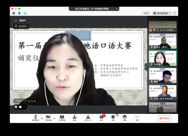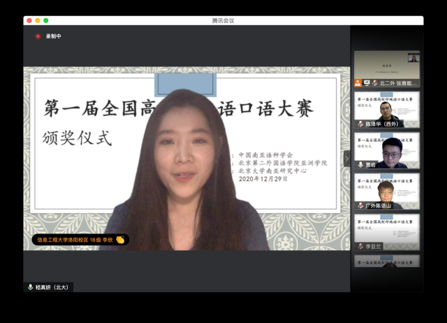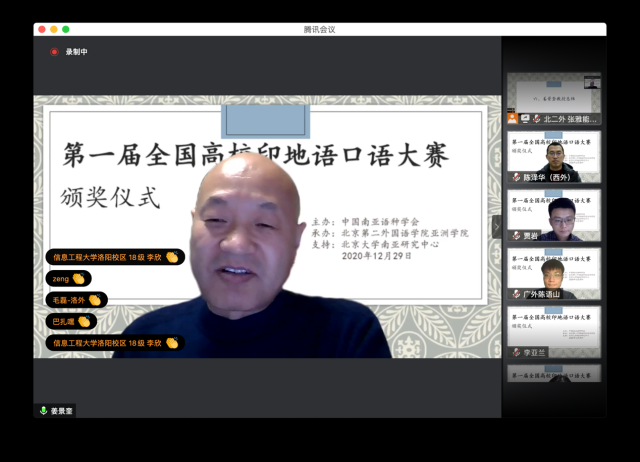 2020年12月29日晚,“第一届全国高校印地语专业口语大赛”颁奖仪式在线上举行。本次大赛是全国范围内举办的第一届高校印地语专业技能大赛,由中国南亚语种学会主办、北京第二乐鱼·体育亚洲学院承办、北京大学南亚研究中心支持。中国南亚语种学会会长、教育部高校外指委副主任委员、非通用语分指委主任委员、北京大学南亚研究中心主任姜景奎教授和北京第二乐鱼·体育亚洲学院副院长陈冰冰教授出席颁奖仪式并致辞。来自全国14所高校的近两百名印地语专业师生在线参与,共襄盛举。颁奖仪式由北京大学印地语专业助理教授、南亚研究中心主任助理贾岩主持。
