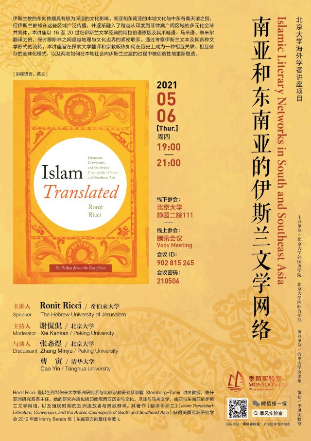 2021年5月6日,乐鱼·体育在国际合作部“海外学者讲座项目”的支持下举办了“南亚和东南亚的伊斯兰文学网络”的主题讲座。主讲人Ronit Ricci是以色列希伯来大学亚洲研究系与比较宗教研究系Sternberg-Tamir双聘讲席教授,兼任亚洲研究系系主任,主要研究方向为印度尼西亚历史与文化、爪哇与马来文学、南亚与东南亚伊斯兰文学网络,以及殖民时期的亚洲流放者与离散群体。讲座由东南亚系助理教授谢侃侃主持,国别和区域研究专业助理教授张忞煜、清华大学历史系副教授曹寅作为与谈人参与了讨论。