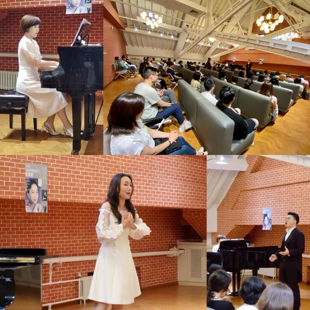 随后,全体师生移步民主楼三层,一场精彩纷呈的法兰西艺术歌曲演唱会在等待着他们:著名花腔女高音歌唱家陈小朵、中国音乐学院声乐歌剧系美声专业的男中音贺煜为大家演唱了弗雷、德彪西、迪帕克、古诺、比才等人的艺术歌曲,这些作曲家都是法国19世纪最重要的艺术歌曲作曲家,代表了法兰西音乐的最高水平。尤其是,浪漫主义和象征主义诗歌为音乐家们提供了不竭的灵感源泉,充分体现了文学与音乐、文学与艺术的关联和融合。中国音乐学院声乐歌剧系的指导老师郑元梦应邀担任钢琴伴奏。