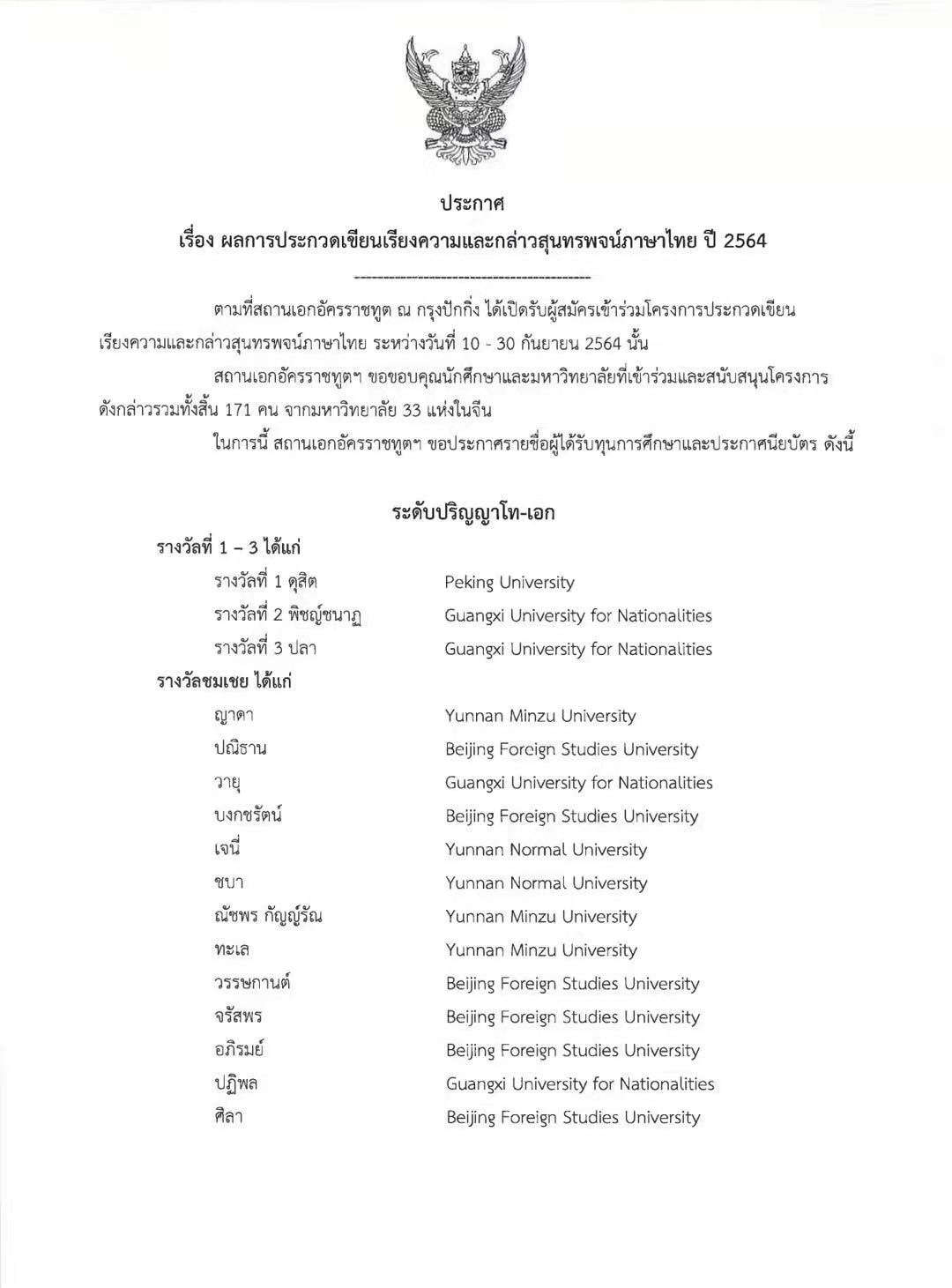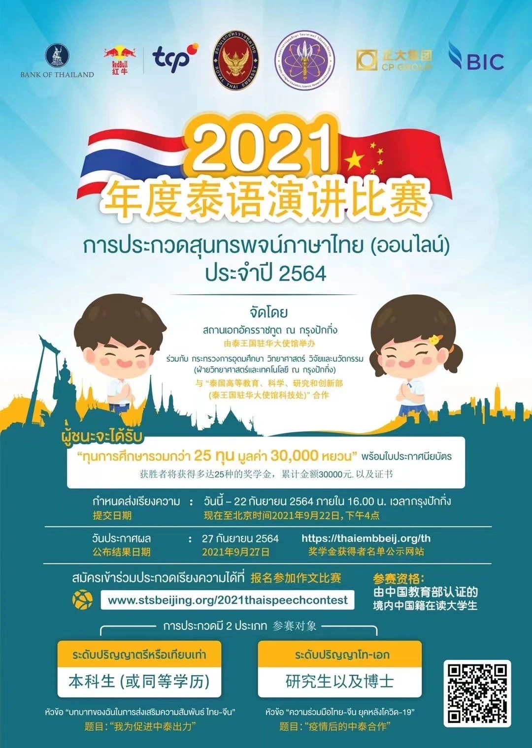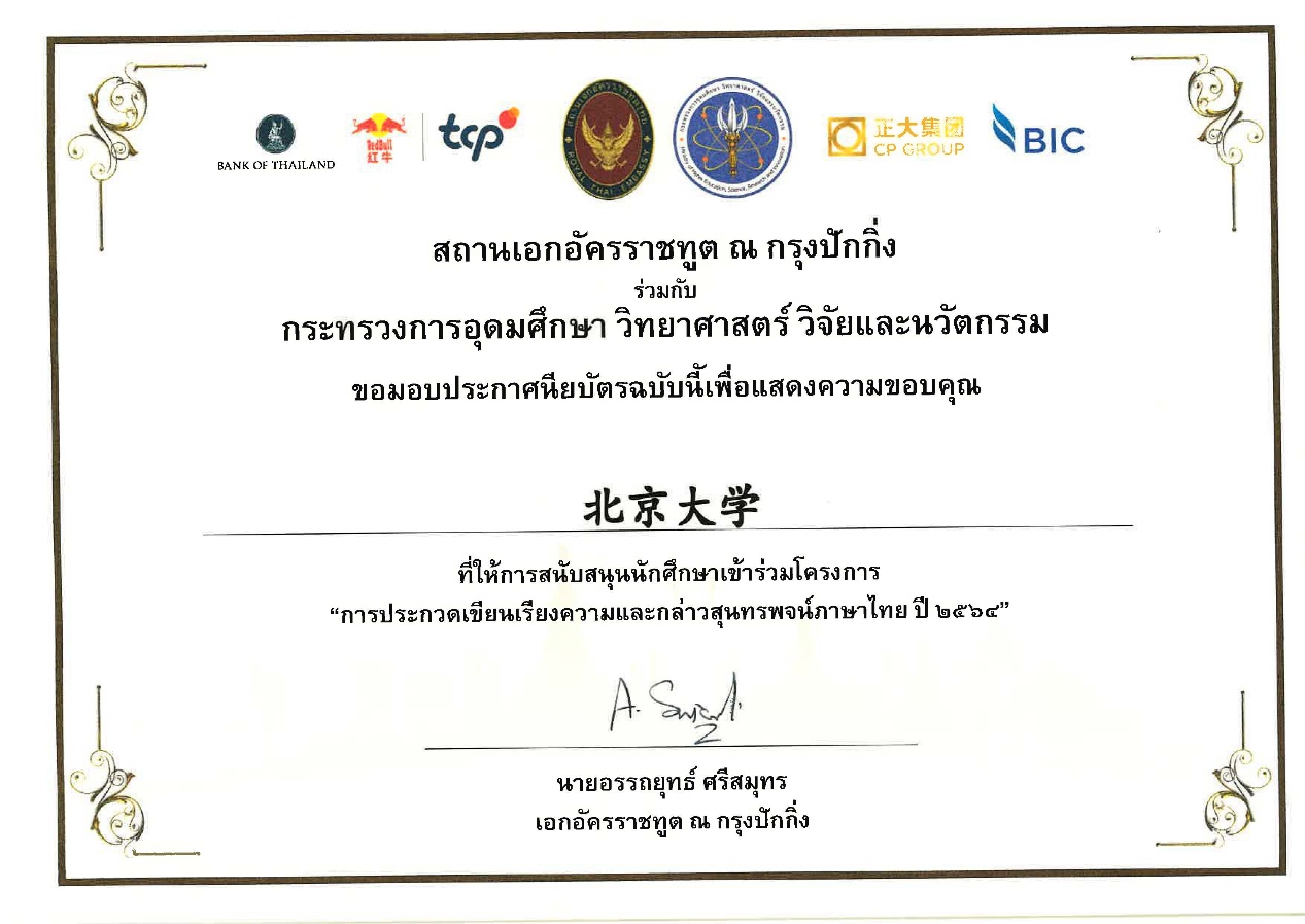 2021年9月10日至30日,“2021年度全国泰语演讲比赛”在线上举行,乐鱼·体育东南亚系2018级泰语专业硕士生陈洪锋在众多参赛选手中脱颖而出,荣获硕-博组第一名。此次演讲比赛由泰国驻中国大使馆主办,旨在促进中泰之间的教育、语言和文化交流,获得了泰国高等教育科研与创新部(Ministry of Higher Education, Science, Research and Innovation)、泰国中央银行(Bank of Thailand)、天丝集团(TCP Group)、红牛饮料有限公司(Red Bull Beverage Co.,Ltd.)、正大集团(CP Group)等多所机构的支持。此次演讲比赛是泰国驻中国大使馆举办的第二届全国性泰语演讲比赛,分为“写作”和“演讲”两个部分。虽然受疫情影响,此次演讲比赛以线上形式举办,但参与院校数和参赛人数均远超以往。据统计,主办方共收到来自全国33所高校泰语专业本硕博学生的踊跃投稿,参加人数达171人。