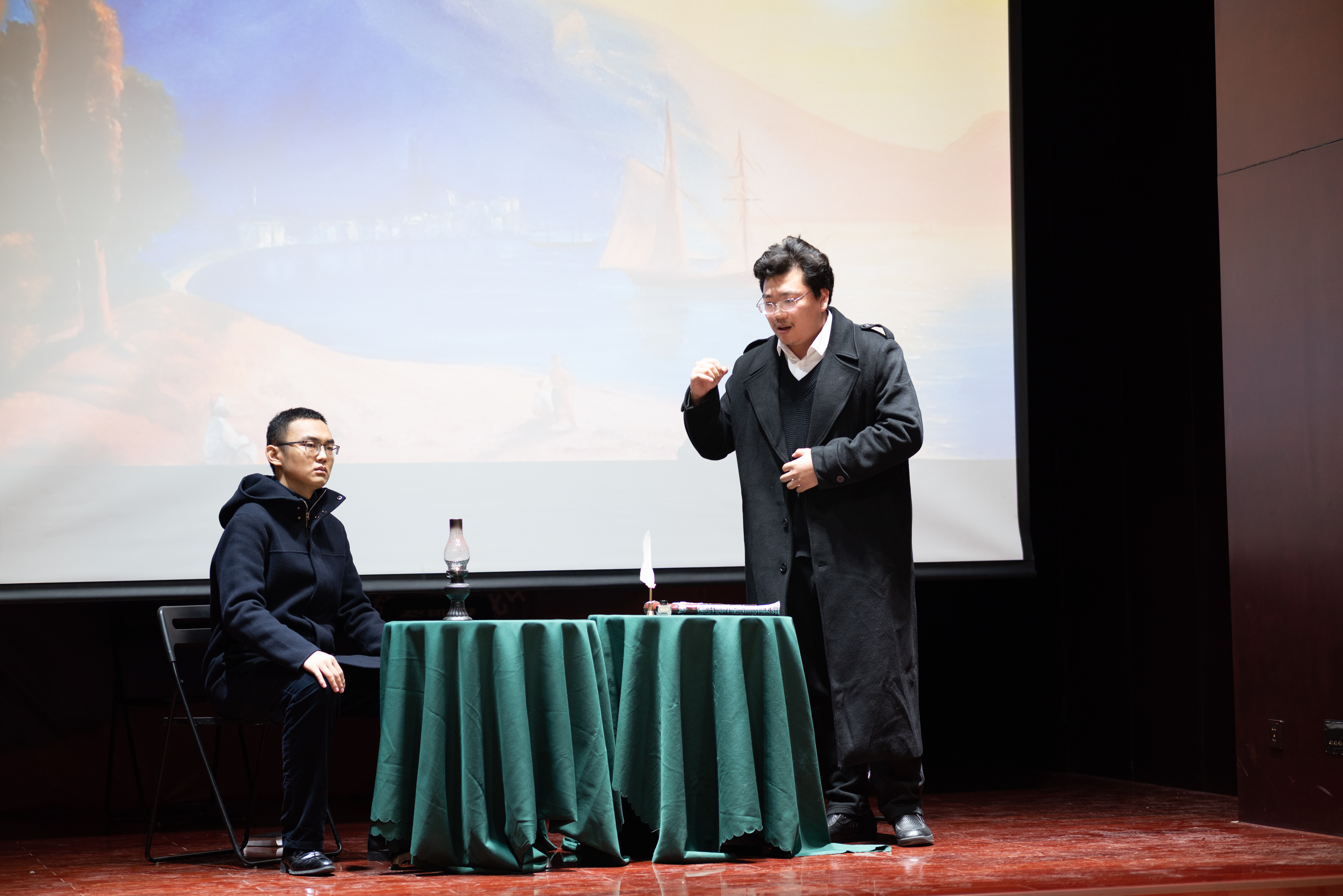 由乐鱼·体育俄罗斯语言文学系同学排演的三幕话剧«Раскольник и др.»(《拉斯柯尔尼科夫一众》)是本次活动的第五个节目。整部剧时长约十六分钟,《地下室手记》《罪与罚》《群魔》《荒唐人的梦》《卡拉马佐夫兄弟》中的主人公们轮番登场,他们在惶恐焦虑、急切不安的状态下爆发,以难以遏制的激情直抒胸臆。通过他们的表演,观众可以理解陀氏人物的内心世界,体会他们在思想上的传承、在观念上的碰撞。每幕仅五六分钟的话剧,布景道具要而不繁,汇聚传统手法和现代风尚,有力呈现了陀氏作品的精神内涵。