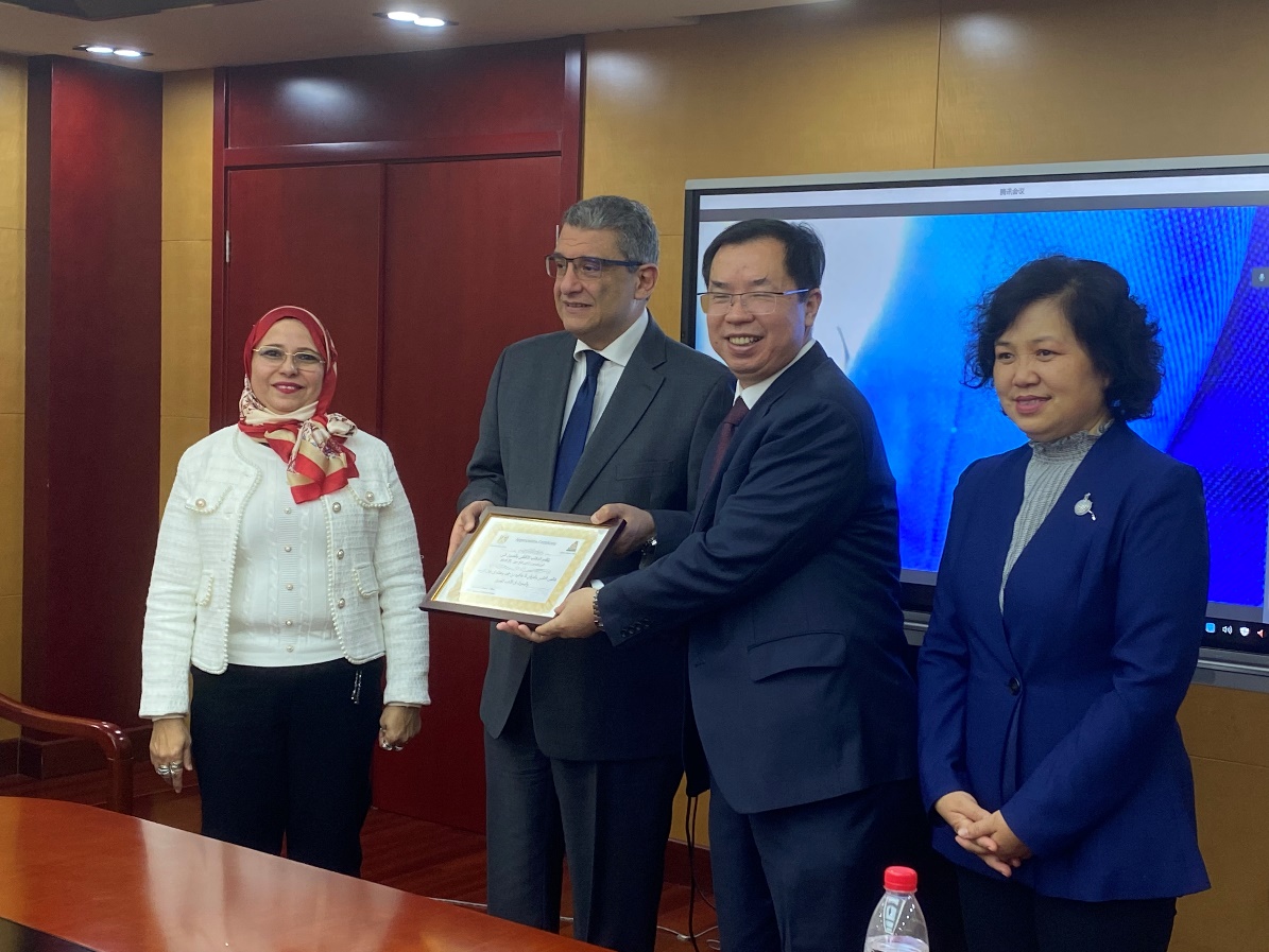 开幕式之后,举办了一场别开生面的线上+线下的颁奖仪式,巴德里大使为林丰民、薛庆国、葛铁鹰等12位获得“埃及文学翻译与研究奖”的中国学者颁发了奖状。