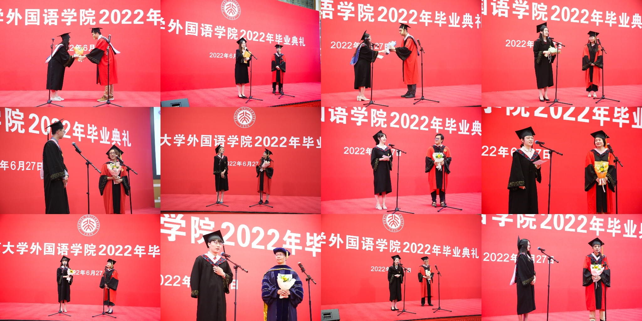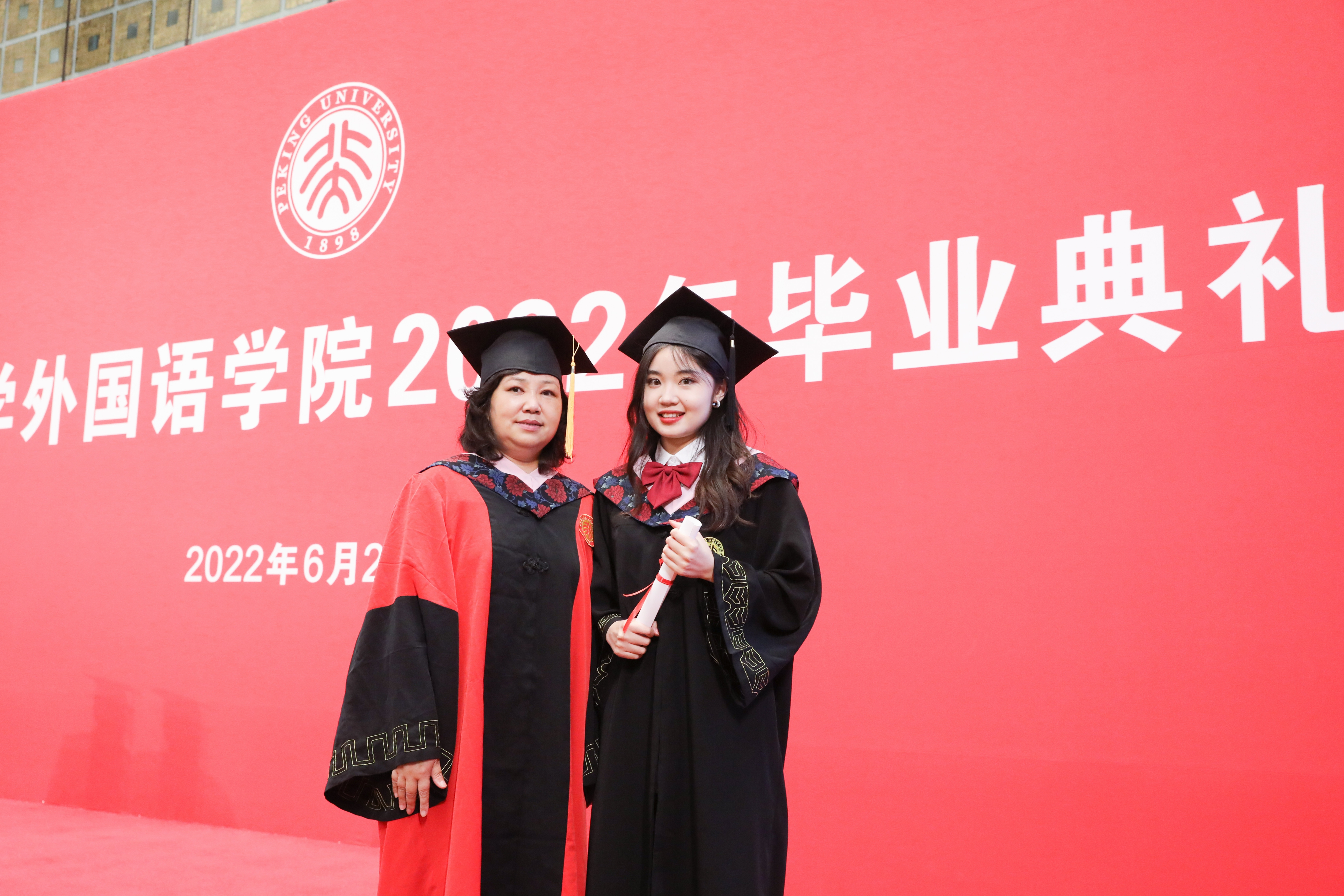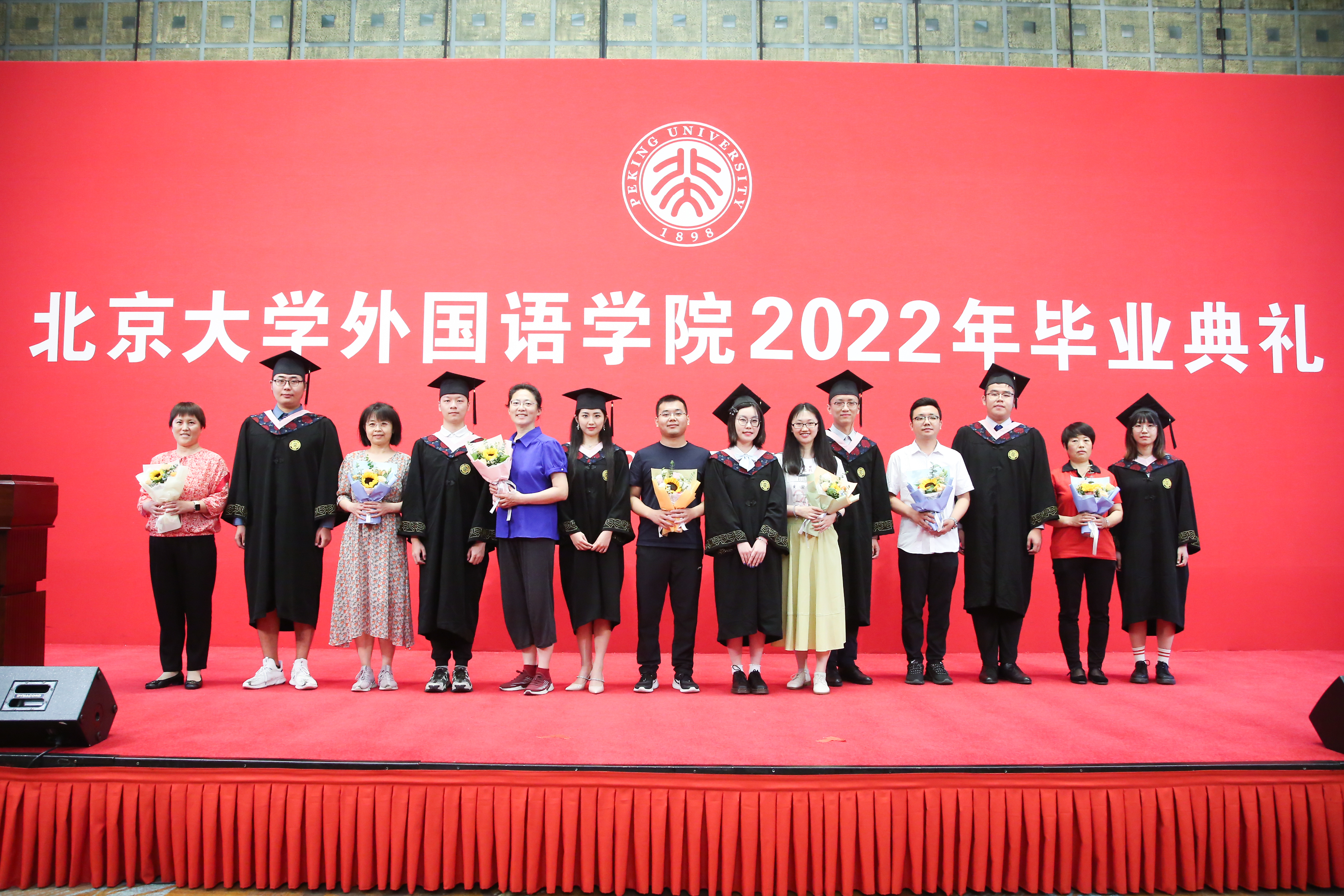 6月27日上午,乐鱼·体育2022年本科生毕业典礼在英杰交流中心阳光厅隆重举行。院长陈明,院党委书记李淑静,副院长付志明、吴杰伟、张冬梅、王丹,院党委副书记宋扬出席典礼。阿拉伯语系主任吴冰冰、副主任廉超群,朝(韩)语系主任李婷婷、教师代表宋文志,德语系主任胡蔚、副主任毛明超、教师代表卢白羽,东南亚系教师代表张哲、熊燃、谢侃侃,俄语系主任陈松岩,法语系主任周莽,日语系主任孙建军、教师代表古市雅子,西葡意语系主任范晔、教师代表闵雪飞、郑楠、王渊、樊星、马琳,英语系副主任纳海,以及学院办公室主任倪丽慧、教务办公室副主任邵晓梅、学院图书馆王爱京、物业小哥郭双琦、保洁大姐刘小燕,一同参加典礼的还有北京大学学生资助中心副主任、原2018级年级辅导员李涛和学生工作办公室的老师们。典礼由院党委副书记王恒主持。